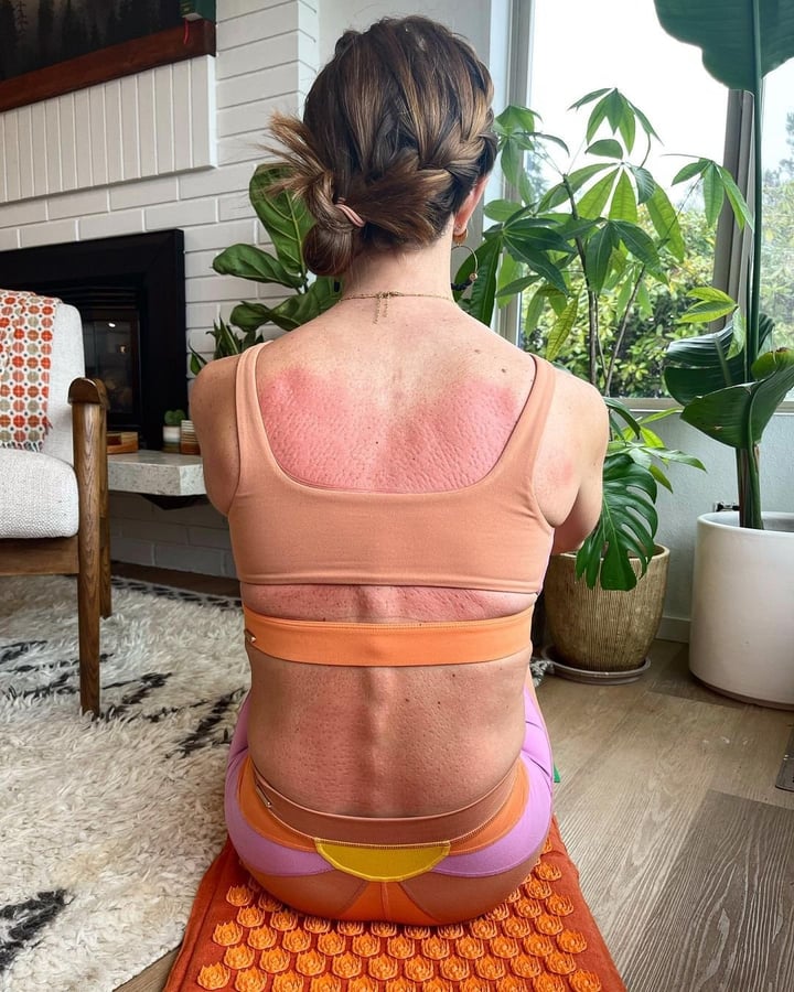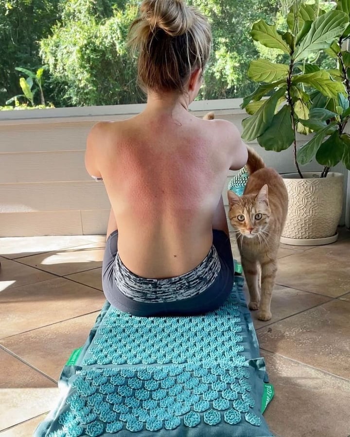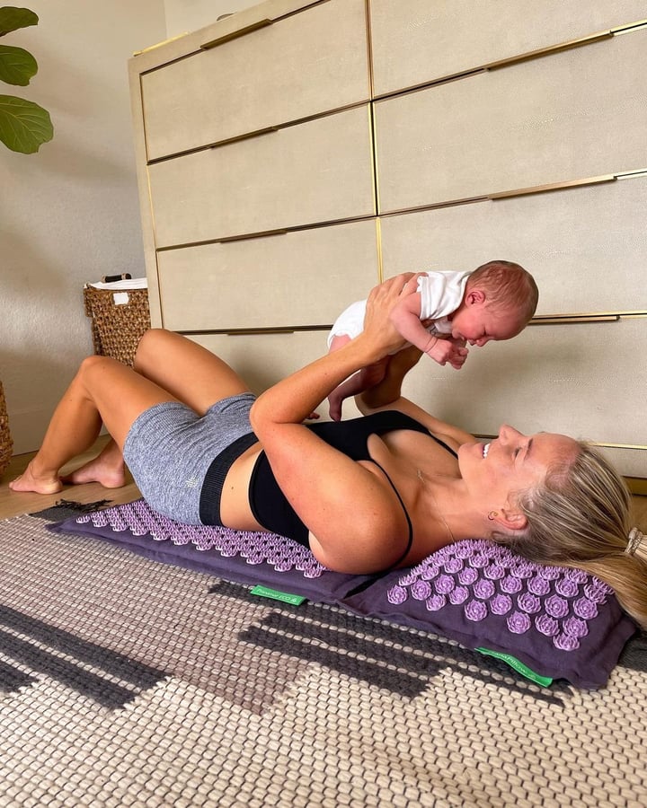 „Ich verwöhne mich gern mit 20 Minuten auf meiner @pranamat, während ich mit Sage kuschele oder stille. Die stacheligen Lotusblumen fühlen sich auf meinem Rücken fantastisch an und nehmen mir all die Schmerzen, die den ganzen Tag über entstehen.